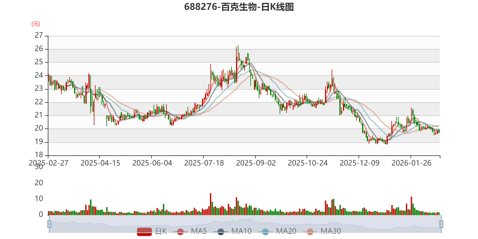 中证智能财讯百克生物(688276)2月26日晚间披露2025年业绩快报,公司实现营业收入5.92亿元,同比下降51.85%;归母净利润亏损2.72亿元,上年同期盈利2.32亿元;扣非净利润亏损2.89亿元,上年同期盈利2.3亿元;基本每股收益-0.66元,加权平均净资产收益率为-6.62%。以最新收盘价计算,市净率(LF)约2.06倍,市销率(TTM)约12.05倍。
