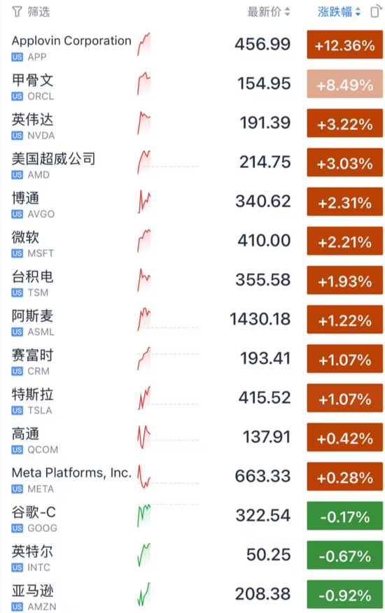科技股普遍上涨,英伟达股价大涨超3%,甲骨文股价一度涨超10%。