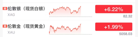 贵金属方面,现货白银暴涨超6%,现货黄金涨近2%。